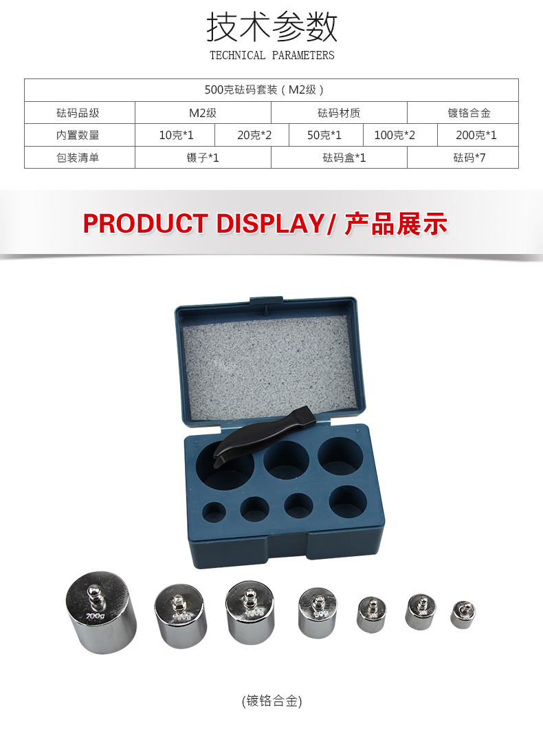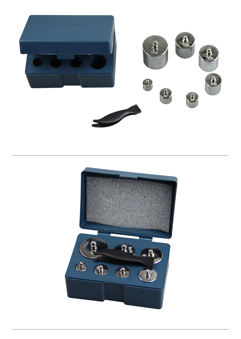 【砝码外观】:钢制镀铬砝码,有着接近镜面的光亮度,触感硬朗冰冷,属于比较前卫的装饰材料,符合金属时代的酷感审美。钢制砝码因为需要在表面做多种防腐蚀镀铬的处理,所以可以制成很多的颜色。【保养技巧】:放置砝码的库房应洁净干燥,保证一定温度、湿度、砝码码放时底部应铺垫木,上部用布或薄膜覆盖、定期观察记录。